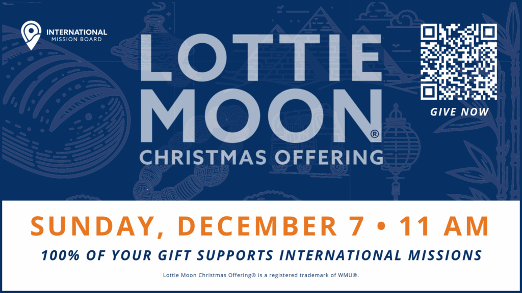 Join us for our Lottie Moon Christmas Offering service on Sunday, December 7th! 100% of your gift goes directly toward supporting global missions through the International Mission Board!