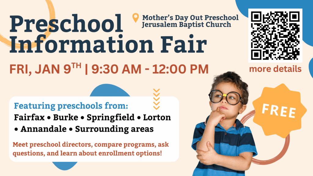Join us for a FREE Preschool Information Fair hosted by Mother’s Day Out, featuring preschools from Fairfax, Burke, Springfield, Lorton, Annandale, and the surrounding areas! Meet preschool directors, compare programs, ask questions, and learn about enrollment options!